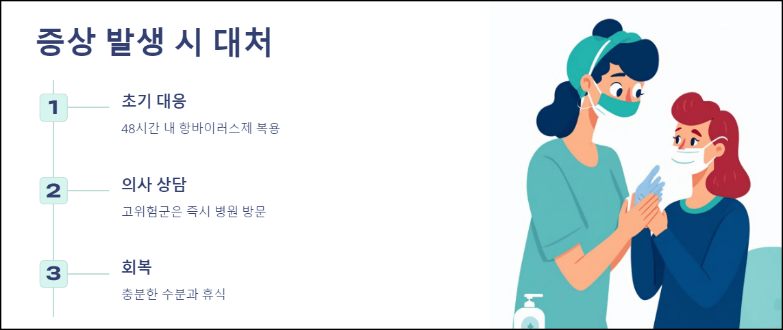 - 증상이 시작되면 48시간 이내 항바이러스제를 복용하세요.
