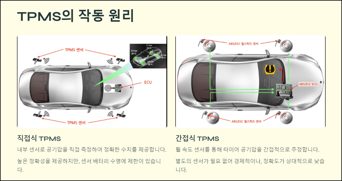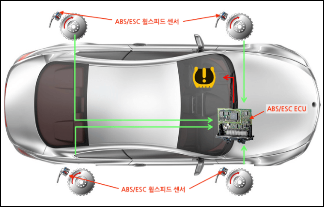 - ABS(브레이크 잠김 방지 시스템)나 ESC(차체 안정성 제어 시스템)의 휠 속도 센서를 사용해 타이어 회전 속도를 비교하여 공기압 상태를 추정합니다.