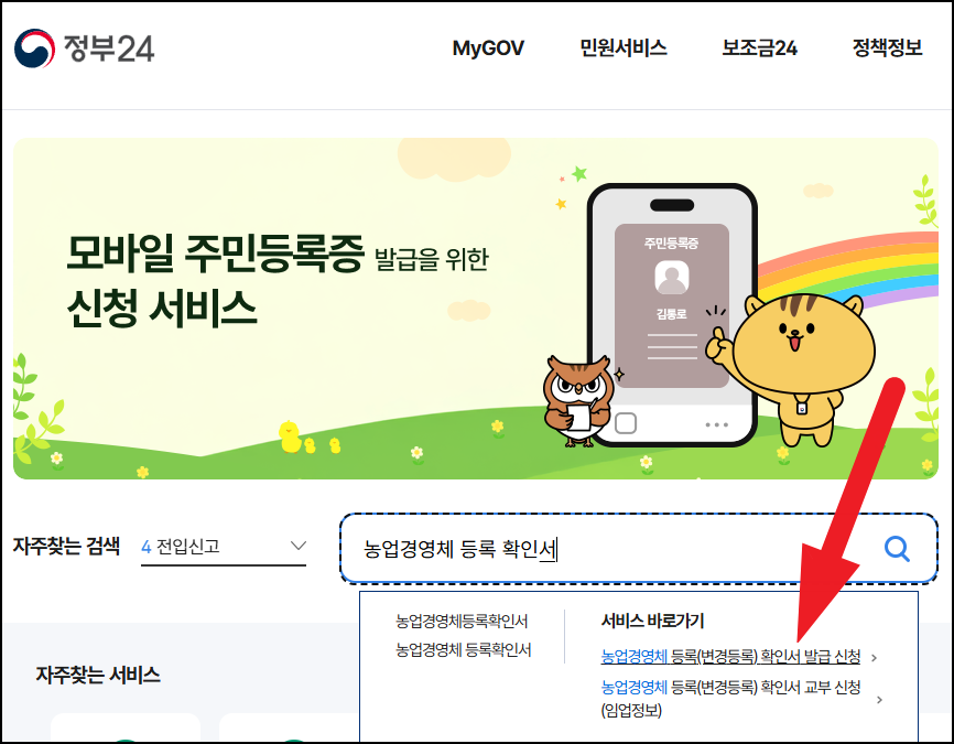 - 검색창에 “농업경영체 등록 확인서” 입력